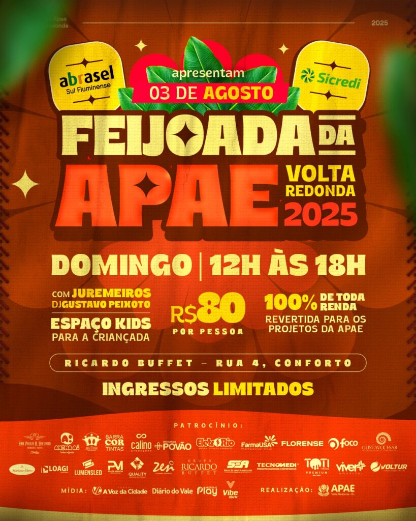 Onde comprar: https://www.sympla.com.br/evento/feijoada-da-apae-volta-redonda-2025/3028946