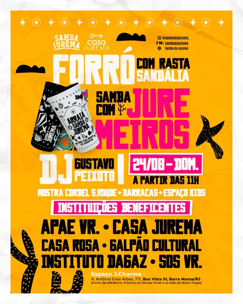 O evento promete um domingo inteiro de festa, reunindo o melhor da cultura popular em um formato especial. E como é arraiá, vai ter forró, e como é Samba da Jurema, é lógico que vai ter muito samba raiz e pagode 90. As atrações vão celebrar a diversidade da música brasileira: o forró do grupo Rasta Sandália e a roda de samba dos Juremeiros. Os intervalos serão animados pelo DJ Gustavo Peixoto.
